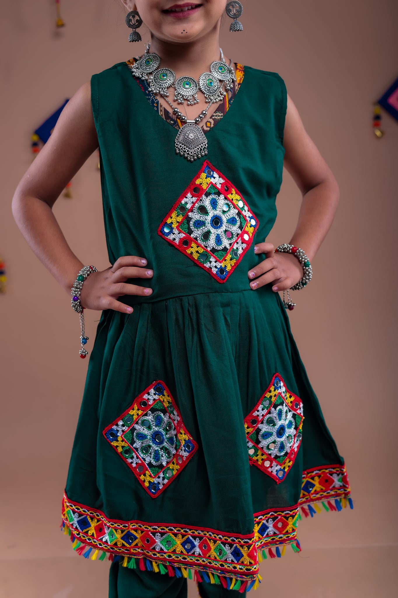 The Banjara India Kutchi Embroidered Girls Dhoti Set (DHT-111) - Green is evocative, to say the least, but that's why you're drawn to it in the first place.